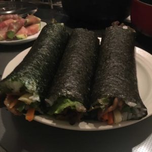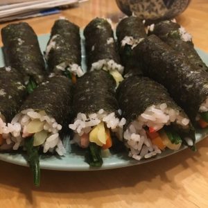 長めに作った恵方巻と、余ったごはんと具材でキンパ風に😄